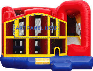 5 - 1 Combo inflatalbe unit has a bounce area, pop up obstacles, climbing steps to slide and basketball goal for small balls (please provide your own balls). This item can be used wet or dry. If you are using it wet please provide your own 50 to 75 foot hose. Reminder, do not place this slide further then 50 feet from your water spigot. 20w' x 19'l x 15'h |