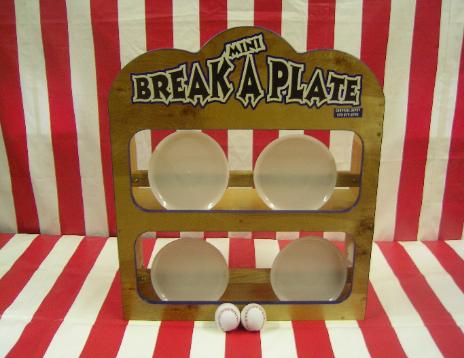 Place one plate on each level. It is a good idea to rent a 10' x 10' tent with back with this game to stop the fly away balls. Tabletop game is 32" x 28" Plates are sold separately in packs of 100 for $49.00. 100 plates will last about 45 minutes during heavy play so be sure to order enough plates to break. Break A Plate game takes special plates designed for this game so regular plastic plates will not work. Our plates are special plastic plates that are designed to break and crack upon impact. These are not glass plates. |